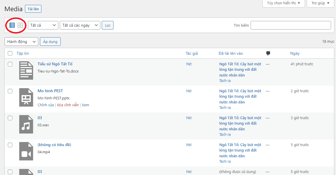 - Bạn có thể Chỉnh sửa, xem hoặc xóa tệp. Không những vậy, bạn còn có thể Sử dụng “hành động” hành loạt cho các tệp đa phương tiện. Giống như danh sách Bài viết và Trang, bạn có thể chọn hộp bên cạnh mỗi mục trong danh sách, sau đó thực hiện hành động trên chúng.