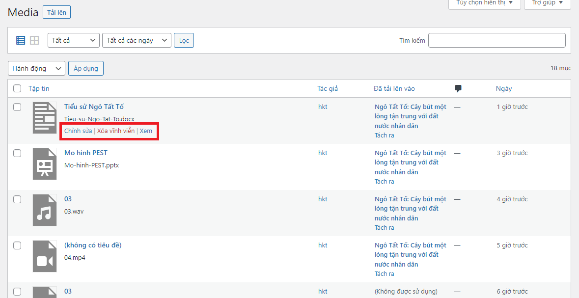 Bạn Click vào “Xóa vĩnh viễn” thì WordPress sẽ xóa file đó ngay lập tức.