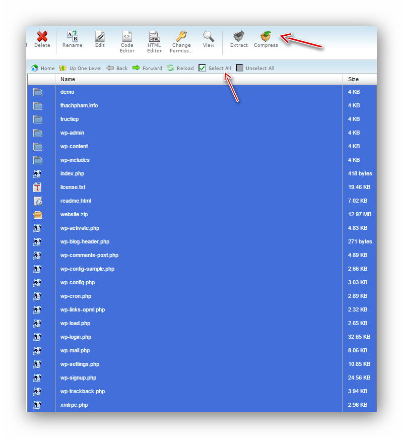 Sau đó truy cập vào thư mục chứa mã nguồn website, ấn nút Select All để chọn tất cả và chọn Compress để nén dữ liệu.
