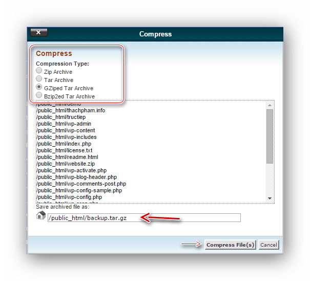 Rồi chọn loại tập tin nén (nên chọn Zip hoặc Gzip), đặt tên cho tập tin nén được tạo ra và ấn nút Compress File(s) để nén toàn bộ mã nguồn lại.