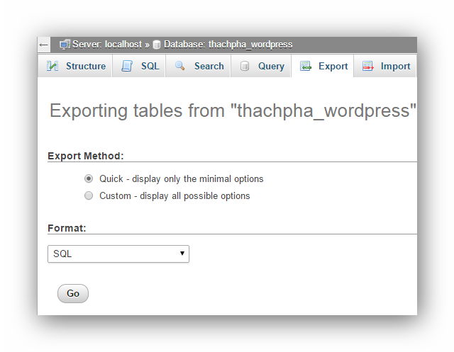 Để thiết lập như mặc định và ấn nút Go để nó bắt đầu tải về máy file .sql chứa database của website bạn.