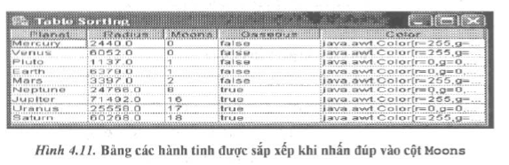 Ví dụ 4.8. Ta hãy tổ chức lại bảng các hành tinh ở ví dụ 4.5 sao cho khi nhấn đúp vào tên của một cột nào đó thì bảng sẽ được sắp xếp lại theo thứ tự các giá trị của cột đó. Vi dụ, nhấn đúp vào cột Moons thì bảng được sắp xếp theo thứ tự tăng dần của sổ lượng vệ tinh của các hành tinh như hình 4.11.