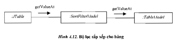 Để sắp xếp được các hàng ta sử dụng mô hình bộ lọc, nó lưu trữ các tham chiếu tới mô hình bảng hiện thời. Khi JTable cần tìm một giá trị, mô hình bộ lọc sẽ tính chỉ số cùa cột hiện thời (cột được nhấn đúp) và nhận lại giá trị từ mô hình bảng.