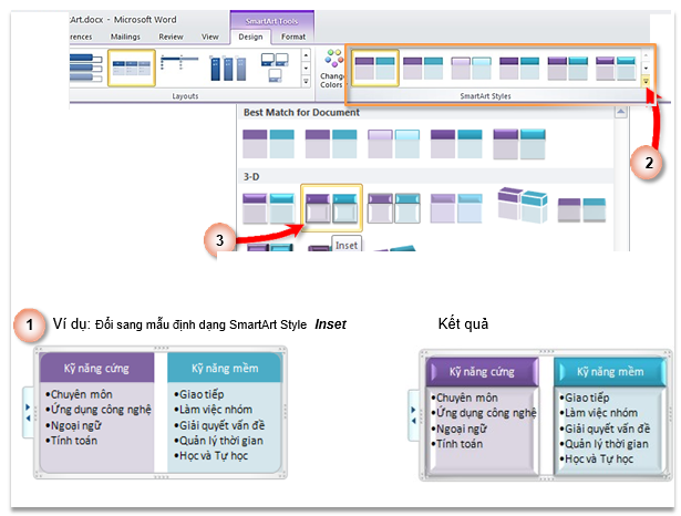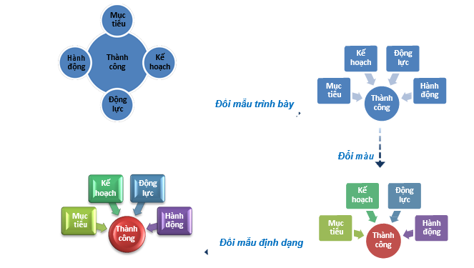 SmartArt có sẵn các mẫu định dạng, hiệu ứng2D, 3D cho các hình (Shape). Phối hợp Change Color và Quick SmartArt Style có được nhiều kết quả định dạng khác nhau.