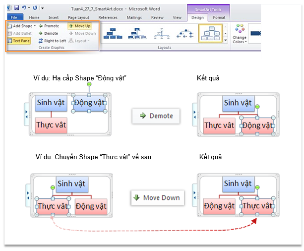 e. Create Graphic – Chuyển cấp/ vị trí các hình trong SmartArt