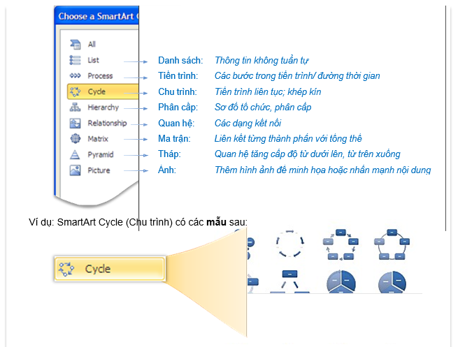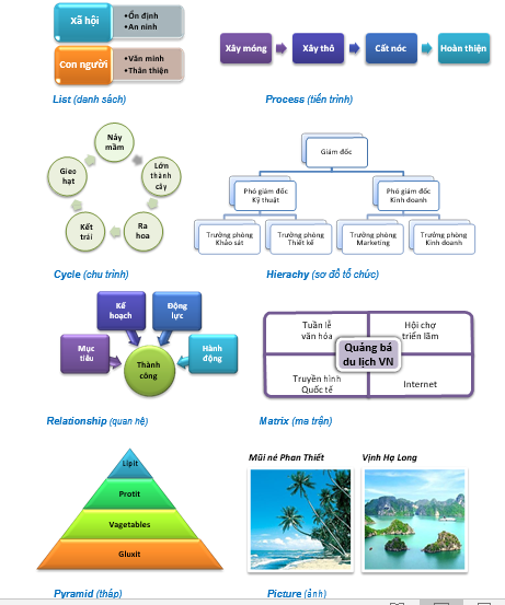 SmartArt có nhiều kiểu diễn đạt mối quan hệ của thông tin như List (liệt kê), Process (tiến trình), Cycle (chu trình)… Trong mỗi kiểu có nhiều mẫu trình bày (xem hình dưới)
