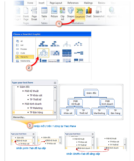 - Nhập các ý chính vào Text Pane của SmartArt. Mỗi ý trên 1 gạch đầu dòng, dùng Tab/ Shift+Tab để hạ/ tăng cấp các gạch đầu dòng