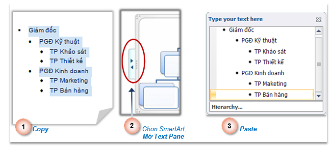 Chú ý: Có thể dùng Copy/ Paste để chuyển nội dung đã được liệt kê theo cấu trúc phân cấp vào Text Pane. (xem hình)