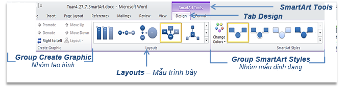 Khi định dạng, cần chọn SmartArt để hiện SmartArt Tools – thanh công cụ định dạng SmartArt