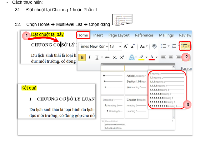 Để các đề mục được đánh số tự động theo các cấp, bạn cần sử dụng Multilevel List.