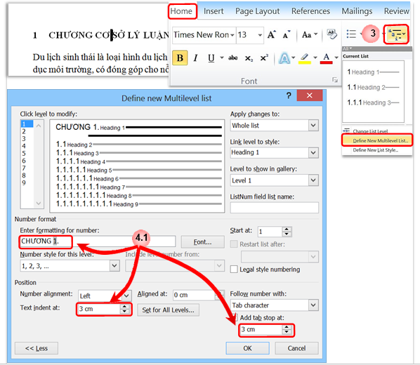 - Chọn Home à Multilevel List à Define New Multilevel List
