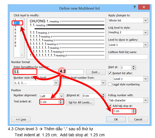 4.2 Chọn level 2 à Thêm dấu “.” sau số thứ tự