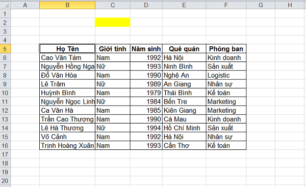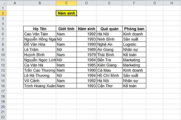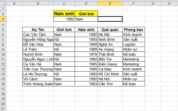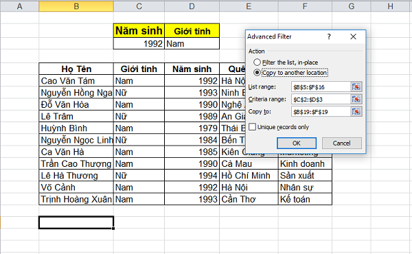 Ví dụ, chọn cột năm sinh làm cột điều kiện, ta copy tiêu đề Năm sinh và dán vào ô được tô màu vàng.