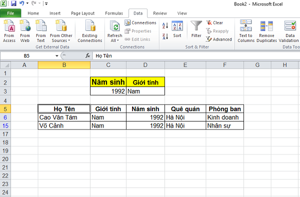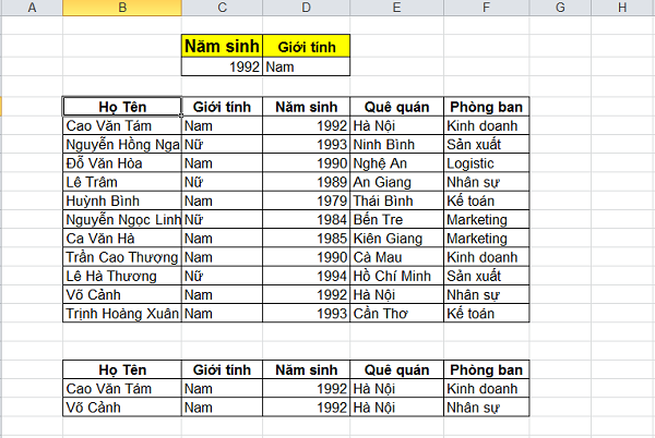 Ví dụ: Điều kiện là sinh năm 1992 và giới tính là Nam