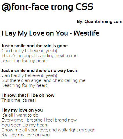 <!DOCTYPE html><html><head><style>@font-face {font-family: FontQuanTriMang;src: url(sansation_light.woff);}* {font-family: FontQuanTriMang;}</style></head><body><h1>@font-face trong CSS</h1><div style="text-align: right; font-weight:bold;">By: Quantrimang.com</div><div><h2>My love - Westlife</h2>An empty street <br>An empty house <br>A hole inside my heart<br>I'm all alone<br>The rooms are getting smaller<br><br>I wonder how<br>I wonder why<br>I wonder where they are<br>The days we had<br>The songs we sang together<br>Oh yeah<br>And all my love<br>I'm holding on forever<br>Reaching for the love that seems so far<br><br>So I say a little prayer<br>And hope my dreams will take me there<br>Where the skies are blue<br>To see you once again, my love<br>Over seas from coast to coast<br>To find the place I love the most<br>Where the fields are green<br>To see you once again, my love<br></div></body></html>