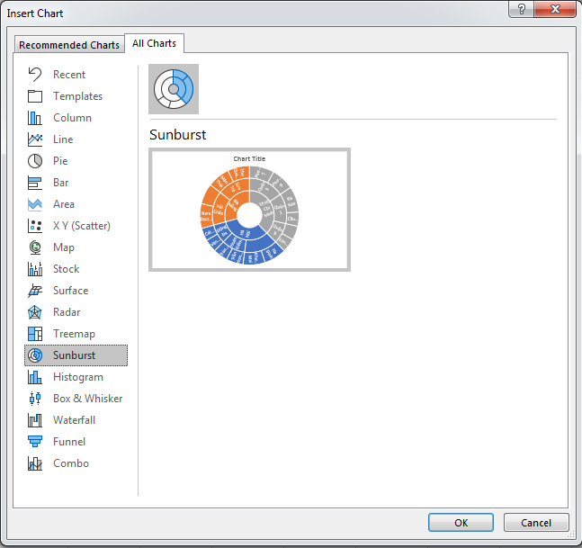 Chọn Insert -> Insert Chart -> Sunburst Chart