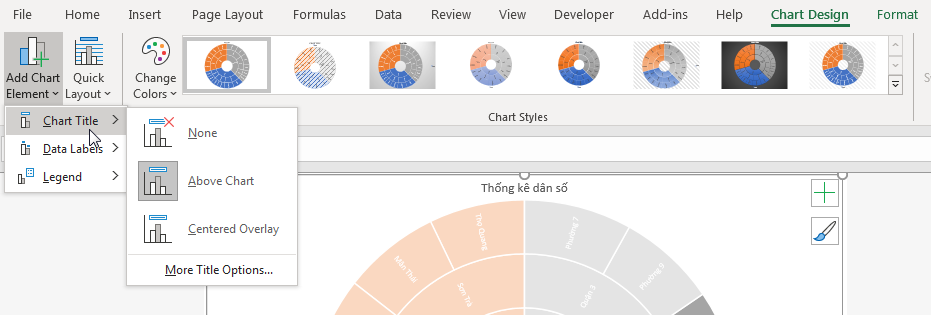 Mỗi biểu đồ cần có một cái tên. Sunburst cũng vậy, và ta có thể thêm tên cho biểu đồ bằng cách trong mục Chart Design chọn Add Chart Element > Chart Title