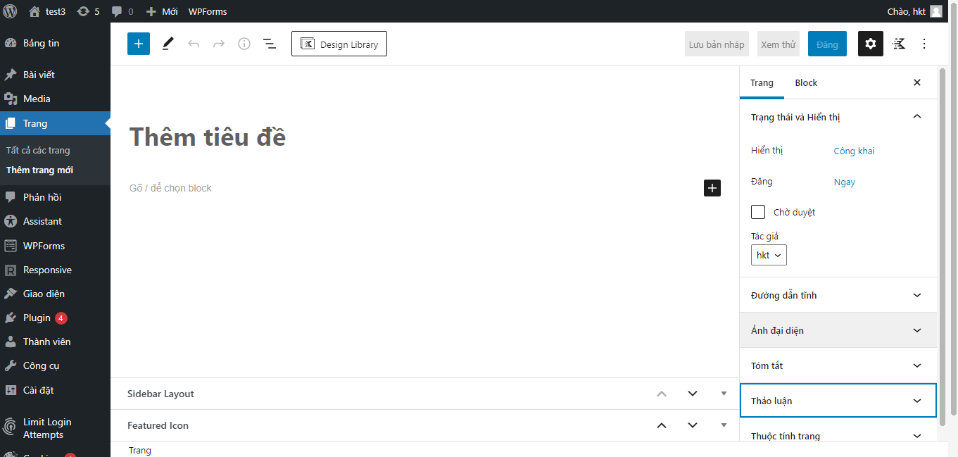 Phần lớn của giao diện sẽ là trình chỉnh sửa nội dung của Trang, bao gồm Tiêu đề và nội dung. Ở bên phải bạn sẽ thấy các khối Đăng, Thuộc tính trang và Ảnh đại diện.