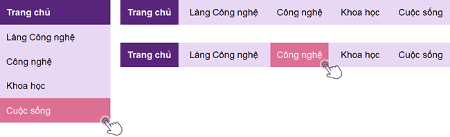 <!DOCTYPE html><html><head><style>h2 {color: #58257b}ul {list-style-type: none;margin: 0;padding: 0;overflow: hidden;background-color: #e9d8f4;}li {float: left;}li a {display: block;color: black;text-align: center;padding: 14px 16px;text-decoration: none;}li a:hover {color: white;background-color: #db7093;font-weight: bold;}</style></head><body><h2>Thanh điều hướng ngang - Website Quản trị mạng</h2><ul><li><a href="https://quantrimang.com/">Trang chủ</a></li><li><a href="https://quantrimang.com/lang-cong-nghe">Làng Công nghệ</a></li><li><a href="https://quantrimang.com/cong-nghe">Công nghệ</a></li><li><a href="https://quantrimang.com/khoa-hoc">Khoa học</a></li><li><a href="https://quantrimang.com/cuoc-song">Cuộc sống</a></li></ul></body></html>