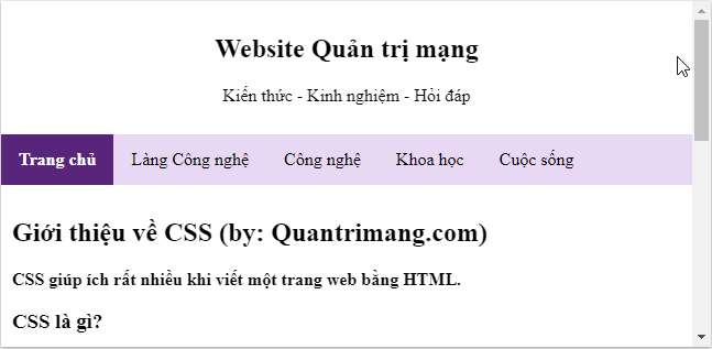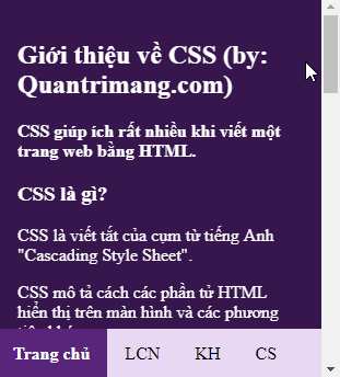 <!DOCTYPE html><html><head><style>body {margin: 0;}ul {list-style-type: none;margin: 0;padding: 0;width: 25%;background-color: #e9d8f4;position: fixed;height: 100%;overflow: auto;}li a {display: block;color: #000;padding: 8px 16px;text-decoration: none;}li a.active {background-color: #58257b;font-weight: bold;color: white;}li a:hover:not(.active) {background-color: #db7093;font-weight: bold;color: white;}</style></head><body><ul><li><a class="active" href="https://quantrimang.com/">Trang chủ</a></li><li><a href="https://quantrimang.com/lang-cong-nghe">Làng Công nghệ</a></li><li><a href="https://quantrimang.com/cong-nghe">Công nghệ</a></li><li><a href="https://quantrimang.com/khoa-hoc">Khoa học</a></li><li><a href="https://quantrimang.com/cuoc-song">Cuộc sống</a></li></ul><div style="margin-left:25%;padding:1px 16px;height:1000px;"><h2>Giới thiệu về CSS (by: Quantrimang.com)</h2><h3>CSS giúp ích rất nhiều khi viết một trang web bằng HTML.</h3><p><strong>CSS là gì?</strong></p><p>CSS là viết tắt của cụm từ tiếng Anh "Cascading Style Sheet".</p><p>CSS mô tả cách các phần tử HTML hiển thị trên màn hình và các phương tiện khác.</p><p>CSS rất hữu ích và tiện lợi. Nó có thể kiểm soát tất cả các trang trên một website.</p><p>Các stylesheet ngoài được lưu trữ dưới dạng các tập tin .CSS.</p><p><strong>Vì sao nên dùng CSS?</strong></p><p>CSS được dùng để định nghĩa kiểu cách cho các trang trên website của bạn, gồm cả thiết kế, dàn trang và các cách hiển thị khác nhau trên nhiều thiết bị với kích thước màn hình khác nhau.</p><p><strong>CSS giúp giải quyết vấn đề lớn của HTML.</strong></p><p>HTML không có phần tử để để định dạng cho trang web. HTML chỉ được dùng để tạo nội dung cho trang. Khi các phần tử như <font> và thuộc tính màu sắc được thêm vào HTML 3.2, cơn ác mộng của các nhà phát triển web bắt đầu. Việc phát triển một website lớn mà thêm thông tin font hay màu sắc vào từng trang đòi hỏi rất nhiều thời gian.</p><p>Để giải quyết vấn đề này, World Wide Web Consortium (W3C) đã tạo ra CSS, giúp loại bỏ việc định dạng kiểu cách khỏi trang HTML.Các định nghĩa liên quan đến kiểu cách được đưa vào tập tin .css và nhờ vào tập tin stylesheet ngoài, bạn có thể thay đổi toàn bộ website chỉ bằng một tập tin duy nhất.</p></div></body></html>