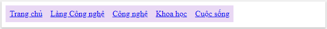 <!DOCTYPE html><html><head><style>ul {list-style-type: none;margin: 0;padding: 0;overflow: hidden;}li {float: left;}li a {display: block;padding: 8px;background-color: #dddddd;}</style></head><body><ul><li><a href="https://quantrimang.com/">Trang chủ</a></li><li><a href="https://quantrimang.com/lang-cong-nghe">Làng Công nghệ</a></li><li><a href="https://quantrimang.com/cong-nghe">Công nghệ</a></li><li><a href="https://quantrimang.com/khoa-hoc">Khoa học</a></li><li><a href="https://quantrimang.com/cuoc-song">Cuộc sống</a></li></ul></body></html>