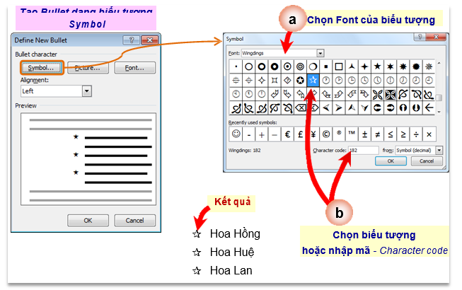 + Chọn Symbol nếu muốn tạo hoa thị là biểu tượng: