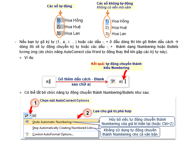 – Khi lựa chọn các số/ký tự… mà có nền mờ màu xám ở dưới thì đó là các số/ký tự Word tự động đánh, các số/ký tự đó sẽ được cập nhật nếu có thay đổi. Do đó, không được xóa các số/ký tự này. Ví dụ: