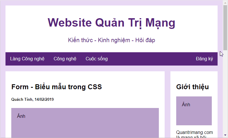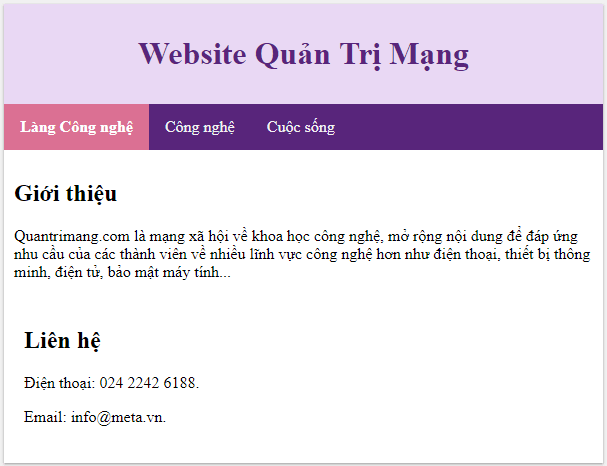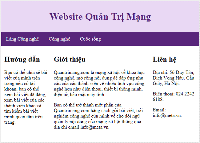 <!DOCTYPE html><html lang="en"><head><title>Thiết kế Layout - Bố cục website trong CSS</title><meta charset="utf-8"><meta name="viewport" content="width=device-width, initial-scale=1"><style>* {box-sizing: border-box;}body {margin: 0;}/* Định dạng header */.header {background-color: #e9d8f4;color: #58257b;padding: 10px;text-align: center;}/* Định dạng thanh điều hướng trên cùng */.topnav {overflow: hidden;background-color: #58257b;}/* Định dạng link điều hướng */.topnav a {float: left;display: block;color: #f2f2f2;text-align: center;padding: 14px 16px;text-decoration: none;}/* Thay đổi màu liên kết khi di chuột qua */.topnav a:hover {background-color: #db7093;color: white;font-weight: bold}/* Tạo ba cột không bằng nhau, float cạnh nhau */.column {float: left;padding: 10px;}/* Cột bên trái và phải */.column.side {width: 25%;}/* Cột chính giữa */.column.middle {width: 50%;}/* Clear float khác sau các cột */.row:after {content: "";display: table;clear: both;}/* Bố cục linh hoạt: ba cột xếp chồng lên nhau thay vì cạnh nhau khi màn hình có chiều rộng dưới 600px */@media screen and (max-width: 600px) {.column.side, .column.middle {width: 100%;}}</style></head><body><div class="header"><h1>Website Quản Trị Mạng</h1></div><div class="topnav"><a href="#">Làng Công nghệ</a><a href="#">Công nghệ</a><a href="#">Cuộc sống</a></div><div class="row"><div class="column side"><h2>Hướng dẫn</h2><p>Bạn có thể chia sẻ bài viết của mình trên trang nếu có tài khoản, bạn có thể xem bài viết đã đăng, xem bài viết của các thành viên khác và tìm kiếm bài viết mình quan tâm trên trang.</p></div><div class="column middle"><h2>Giới thiệu</h2><p>Quantrimang.com là mạng xã hội về khoa học công nghệ, mở rộng nội dung để đáp ứng nhu cầu của các thành viên về nhiều lĩnh vực công nghệ hơn như điện thoại, thiết bị thông minh, điện tử, bảo mật máy tính...</p><p>Bạn có thể trở thành một phần của Quantrimang.com bằng cách gửi bài viết, trải nghiệm công nghệ của mình về cho đội ngũ quản lý nội dung của mạng xã hội thông qua địa chỉ email info@meta.vn</p></div><div class="column side"><h2>Liên hệ</h2><p>Địa chỉ: 56 Duy Tân, Dịch Vọng Hậu, Cầu Giấy, Hà Nội.</p><p>Điện thoại: 024 2242 6188.</p><p>Email: info@meta.vn.</p></div></div></body></html>