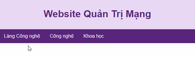 <!DOCTYPE html><html lang="en"><head><title>Thiết kế Layout - Bố cục website trong CSS</title><meta charset="utf-8"><meta name="viewport" content="width=device-width, initial-scale=1"><style>* {box-sizing: border-box;}body {margin: 0;font-family: arial}/* Định dạng header */.header {background-color: #e9d8f4;color: #58257b;padding: 10px;text-align: center;}/* Định dạng thanh điều hướng trên cùng */.topnav {overflow: hidden;background-color: #58257b;}/* Định dạng link điều hướng */.topnav a {float: left;display: block;color: #f2f2f2;text-align: center;padding: 14px 16px;text-decoration: none;}/* Thay đổi màu liên kết khi di chuột qua */.topnav a:hover {background-color: #db7093;color: white;font-weight: bold}</style></head><body><div class="header"><h1>Website Quản Trị Mạng</h1></div><div class="topnav"><a href="#">Làng Công nghệ</a><a href="#">Công nghệ</a><a href="#">Khoa học</a></div></body></html>