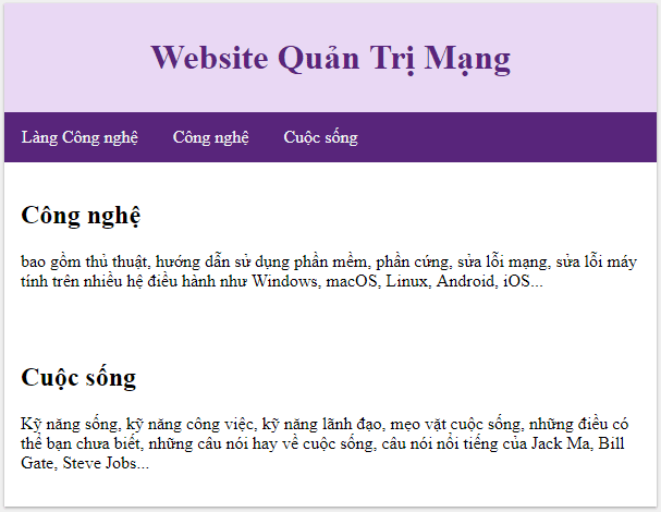 <!DOCTYPE html><html lang="en"><head><title>Thiết kế Layout - Bố cục website trong CSS</title><meta charset="utf-8"><meta name="viewport" content="width=device-width, initial-scale=1"><style>* {box-sizing: border-box;}body {margin: 0;}/* Định dạng header */.header {background-color: #e9d8f4;color: #58257b;padding: 10px;text-align: center;}/* Định dạng thanh điều hướng trên cùng */.topnav {overflow: hidden;background-color: #58257b;}/* Định dạng link điều hướng */.topnav a {float: left;display: block;color: #f2f2f2;text-align: center;padding: 14px 16px;text-decoration: none;}/* Thay đổi màu liên kết khi di chuột qua */.topnav a:hover {background-color: #db7093;color: white;font-weight: bold}/* Tạo ba cột bằng nhau, float cạnh nhau */.column {float: left;width: 33.33%;padding: 15px;}/* Clear float khác sau các cột */.row:after {content: "";display: table;clear: both;}/* Bố cục linh hoạt: ba cột xếp chồng lên nhau thay vì cạnh nhau khi màn hình có chiều rộng dưới 600px */@media screen and (max-width:600px) {.column {width: 100%;}}</style></head><body><div class="header"><h1>Website Quản Trị Mạng</h1></div><div class="topnav"><a href="#">Làng Công nghệ</a><a href="#">Công nghệ</a><a href="#">Cuộc sống</a></div><div class="row"><div class="column"><h2>Làng Công nghệ</h2><p>Cập nhật những xu hướng, khám phá, nghiên cứu mới nhất về khoa học công nghệ.</p></div><div class="column"><h2>Công nghệ</h2><p>bao gồm thủ thuật, hướng dẫn sử dụng phần mềm, phần cứng, sửa lỗi mạng, sửa lỗi máy tính trên nhiều hệ điều hành như Windows, macOS, Linux, Android, iOS...</p></div><div class="column"><h2>Cuộc sống</h2><p>Kỹ năng sống, kỹ năng công việc, kỹ năng lãnh đạo, mẹo vặt cuộc sống, những điều có thể bạn chưa biết, những câu nói hay về cuộc sống, câu nói nổi tiếng của Jack Ma, Bill Gate, Steve Jobs...</p></div></div></body></html>