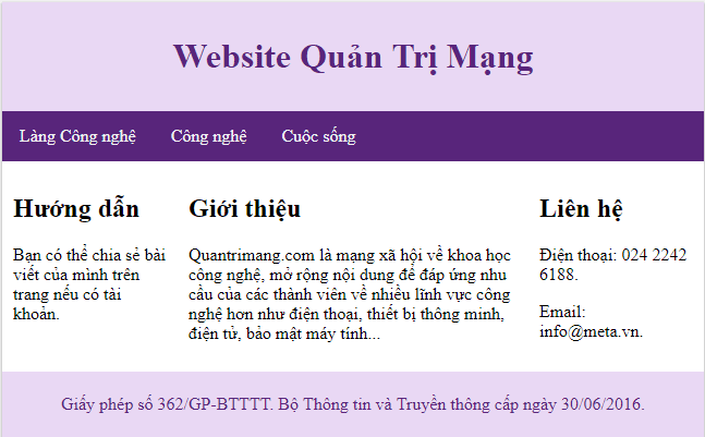 <!DOCTYPE html><html lang="en"><head><title>Thiết kế Layout - Bố cục website trong CSS</title><meta charset="utf-8"><meta name="viewport" content="width=device-width, initial-scale=1"><style>* {box-sizing: border-box;}body {margin: 0;}/* Định dạng header */.header {background-color: #e9d8f4;color: #58257b;padding: 10px;text-align: center;}/* Định dạng thanh điều hướng trên cùng */.topnav {overflow: hidden;background-color: #58257b;}/* Định dạng link điều hướng */.topnav a {float: left;display: block;color: #f2f2f2;text-align: center;padding: 14px 16px;text-decoration: none;}/* Thay đổi màu liên kết khi di chuột qua */.topnav a:hover {background-color: #db7093;color: white;font-weight: bold}/* Tạo ba cột không bằng nhau, float cạnh nhau */.column {float: left;padding: 10px;}/* Cột bên trái và phải */.column.side {width: 25%;}/* Cột chính giữa */.column.middle {width: 50%;}/* Clear float khác sau các cột */.row:after {content: "";display: table;clear: both;}/* Bố cục linh hoạt: ba cột xếp chồng lên nhau thay vì cạnh nhau khi màn hình có chiều rộng dưới 600px */@media screen and (max-width: 600px) {.column.side, .column.middle {width: 100%;}}/* Định dạng footer */.footer {background-color: #e9d8f4;color: #58257b;padding: 5px;text-align: center;}</style></head><body><div class="header"><h1>Website Quản Trị Mạng</h1></div><div class="topnav"><a href="#">Làng Công nghệ</a><a href="#">Công nghệ</a><a href="#">Cuộc sống</a></div><div class="row"><div class="column side"><h2>Hướng dẫn</h2><p>Bạn có thể chia sẻ bài viết của mình trên trang nếu có tài khoản.</p></div><div class="column middle"><h2>Giới thiệu</h2><p>Quantrimang.com là mạng xã hội về khoa học công nghệ, mở rộng nội dung để đáp ứng nhu cầu của các thành viên về nhiều lĩnh vực công nghệ hơn như điện thoại, thiết bị thông minh, điện tử, bảo mật máy tính...</p></div><div class="column side"><h2>Liên hệ</h2><p>Điện thoại: 024 2242 6188.</p><p>Email: info@meta.vn.</p></div></div><div class="footer"><p>Giấy phép số 362/GP-BTTTT. Bộ TT&TT cấp ngày 30/06/2016.</p></div></body></html>