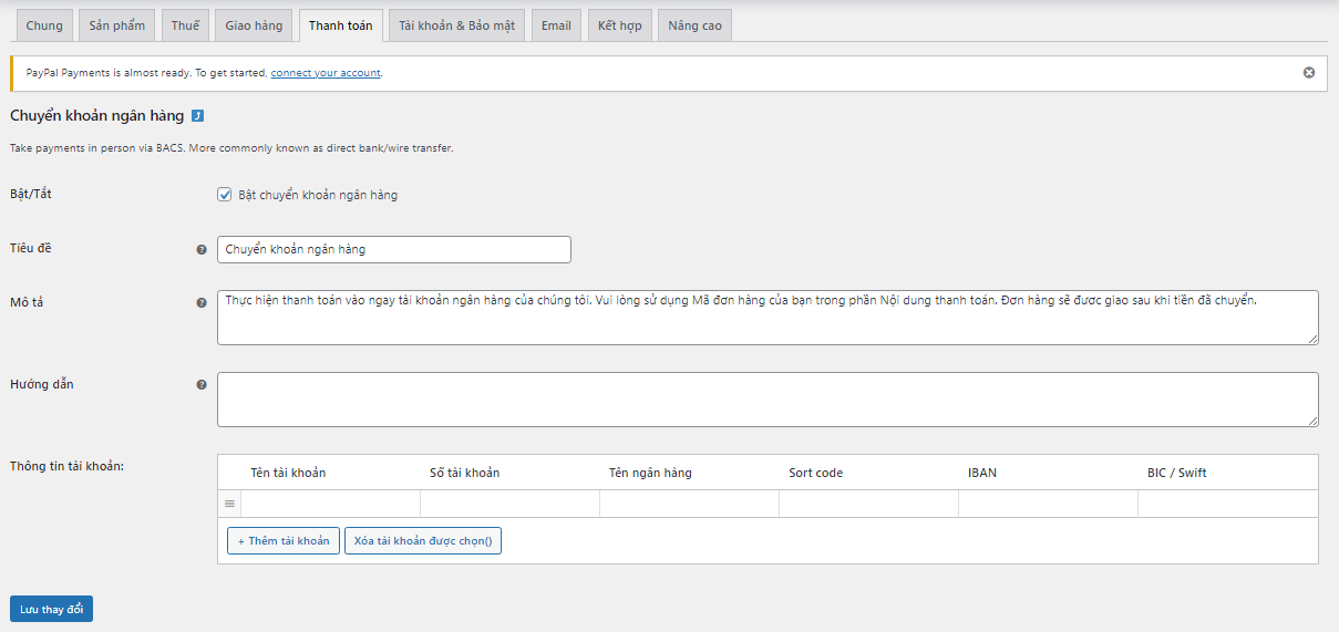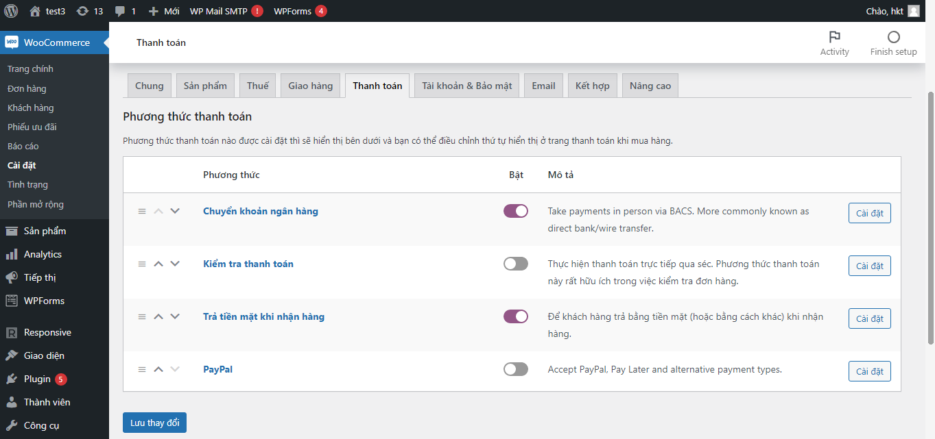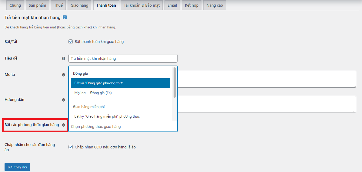 Đừng quên nhấn vào nút “Lưu thay đổi” mỗi khi bạn thay đổi, chỉnh sửa các cài đặt này. Mình sẽ đi vào phần mô tả chi tiết các phương thức thanh toán bên dưới.