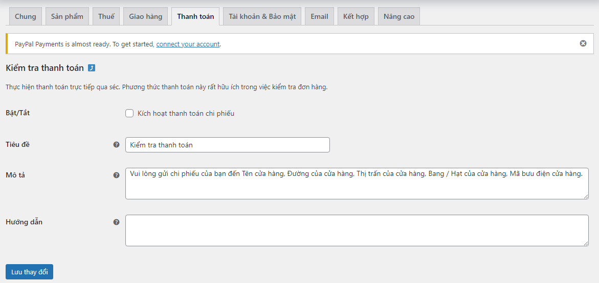 Lưu ý: WooCommerce sẽ không tự động xử lý các giao dịch theo cổng thanh toán này. Bạn phải kiểm tra thủ công nếu giao dịch hoàn tất và sau đó cập nhật chi tiết đơn hàng để bắt đầu quá trình vận chuyển.