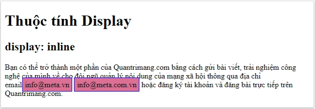 <!DOCTYPE html><html><head><style>span.a {display: inline; /* mặc định với span, a, strong, b, i... */width: 100px;height: 100px;padding: 5px;border: 1px solid blue;background-color: #DB7093;}</style></head><body><h1>Thuộc tính Display</h1><h2>display: inline</h2><div>Bạn có thể trở thành một phần của Quantrimang.com bằng cách gửi bài viết, trải nghiệm công nghệ của mình về cho đội ngũ quản lý nội dung của mạng xã hội thông qua địa chỉ email<span class="a">info@meta.vn</span> <span class="a">info@meta.com.vn</span> hoặc đăng ký tài khoản và đăng bài trực tiếp trên Quantrimang.com.</div></body></html>