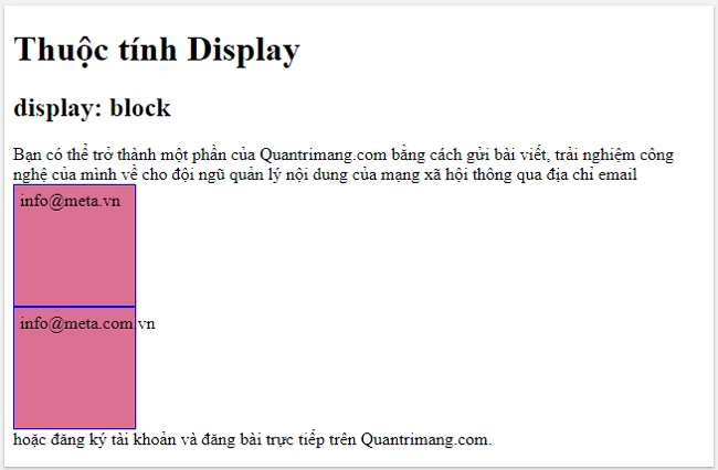 <!DOCTYPE html><html><head><style>span.b {display: block;width: 100px;height: 100px;padding: 5px;border: 1px solid blue;background-color: #DB7093;}</style></head><body><h1>Thuộc tính Display</h1><h2>display: block</h2><div>Bạn có thể trở thành một phần của Quantrimang.com bằng cách gửi bài viết, trải nghiệm công nghệ của mình về cho đội ngũ quản lý nội dung của mạng xã hội thông qua địa chỉ email<span class="b">info@meta.vn</span> <span class="b">info@meta.com.vn</span> hoặc đăng ký tài khoản và đăng bài trực tiếp trên Quantrimang.com.</div></body></html>