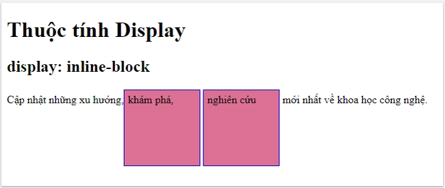 <!DOCTYPE html><html><head><style>span.c {display: inline-block;width: 100px;height: 100px;padding: 5px;border: 1px solid blue;background-color: #DB7093;}</style></head><body><h1>Thuộc tính Display</h1><h2>display: inline-block</h2><div>Cập nhật những xu hướng,<span class="c">khám phá,</span> <span class="c">nghiên cứu</span> mới nhất về khoa học công nghệ.</div></body></html>