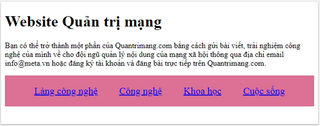 <!DOCTYPE html><html><head><style>.nav {background-color: #DB7093;;list-style-type: none;text-align: center;margin: 0;padding: 0;}.nav li {display: inline-block;font-size: 20px;padding: 20px;}</style></head><body><h1>Website Quản trị mạng</h1><p>Bạn có thể trở thành một phần của Quantrimang.com bằng cách gửi bài viết, trải nghiệm công nghệ của mình về cho đội ngũ quản lý nội dung của mạng xã hội thông qua địa chỉ email info@meta.vn hoặc đăng ký tài khoản và đăng bài trực tiếp trên Quantrimang.com.</p><ul class="nav"><li><a href="#langcongnghe">Làng công nghệ</a></li><li><a href="#congnghe">Công nghệ</a></li><li><a href="#khoahoc">Khoa học</a></li><li><a href="#cuocsong">Cuộc sống</a></li></ul></body></html>