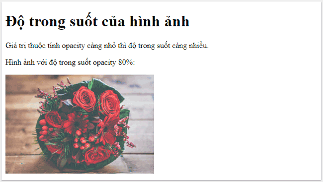 <!DOCTYPE html><html><head><style>img {opacity: 0.8;filter: alpha(opacity=80); /* sử dụng cho IE8 trở về trước */}</style></head><body><h1>Độ trong suốt của hình ảnh</h1><p>Giá trị thuộc tính opacity càng nhỏ thì độ trong suốt càng nhiều.</p><p>Hình ảnh với độ trong suốt opacity 80%:</p><img src="flower-qtm.jpg" alt="Forest" width="300" height="200"></body></html>