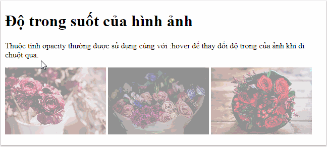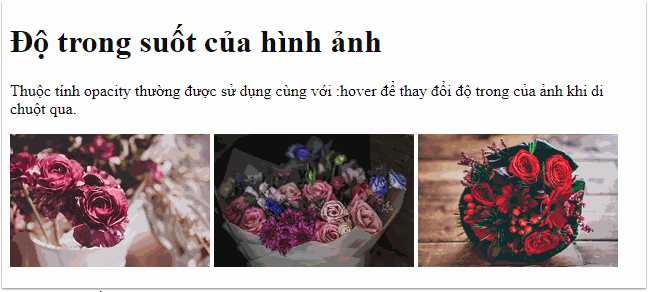 <!DOCTYPE html><html><head><style>img:hover {opacity: 0.5;filter: alpha(opacity=100); /* sử dụng cho IE8 trở về trước */}</style></head><body><h1>Độ trong suốt của hình ảnh</h1><p>Thuộc tính opacity thường được sử dụng cùng với :hover để thay đổi độ trong của ảnh khi di chuột qua.</p><img src="flower-qtm-1.jpg" alt="Flower 1" width="200" height="133"><img src="flower-qtm-2.jpg" alt="Flower 2" width="200" height="133"><img src="flower-qtm-3.jpg" alt="Flower 3" width="200" height="133"></body></html>