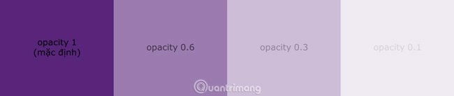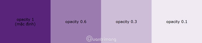 <!DOCTYPE html><html><head><style>h2 {color: purple}div {background-color: #58257b;color: white;padding: 9px;}div.first {opacity: 0.2;filter: alpha(opacity=20); /* sử dụng cho IE8 trở về trước */}div.second {opacity: 0.4;filter: alpha(opacity=40); /* sử dụng cho IE8 trở về trước */}div.third {opacity: 0.6;filter: alpha(opacity=60); /* sử dụng cho IE8 trở về trước */}div.fourth {opacity: 0.8;filter: alpha(opacity=80); /* sử dụng cho IE8 trở về trước */}</style></head><body><h2>Website Quản Trị Mạng</h2><p>Quantrimang.com là mạng xã hội về khoa học công nghệ, đáp ứng nhu cầu về nhiều lĩnh vực công nghệ hơn như điện thoại, thiết bị thông minh, điện tử, bảo mật máy tính...</p><div class="first"><p>Làng công nghệ - opacity 0.2</p></div><div class="second"><p>Công nghệ - opacity 0.4</p></div><div class="third"><p>Khoa học - opacity 0.6</p></div><div class="fourth"><p>Cuộc sống - opacity 0.8</p></div><div><p>Lập trình - opacity 1 (mặc định)</p></div></body></html>