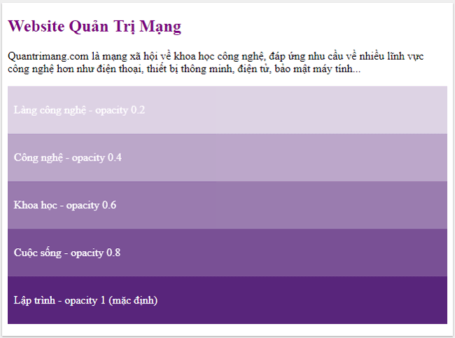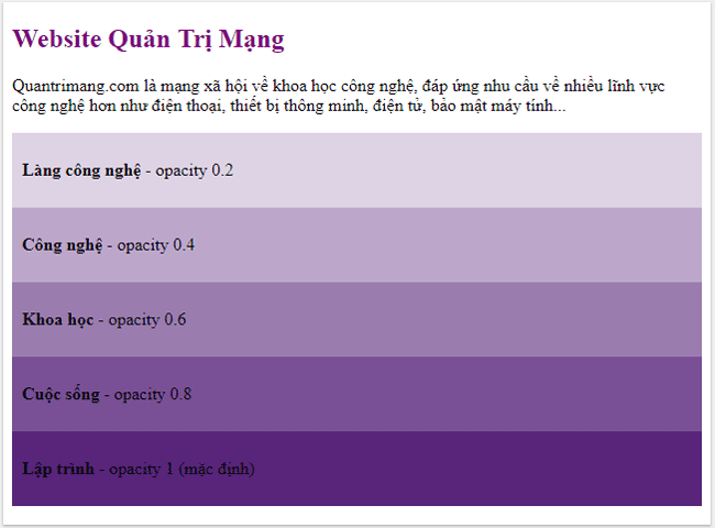 <!DOCTYPE html><html><head><style>h2 {color: purple}div {background-color: rgb(88,37,123);padding: 9px;}div.first {background: rgba(88,37,123, 0.2);}div.second {background: rgba(88,37,123, 0.4);}div.third {background: rgba(88,37,123, 0.6);}div.fourth {background: rgba(88,37,123, 0.8);}</style></head><body><h2>Website Quản Trị Mạng</h2><p>Quantrimang.com là mạng xã hội về khoa học công nghệ, đáp ứng nhu cầu về nhiều lĩnh vực công nghệ hơn như điện thoại, thiết bị thông minh, điện tử, bảo mật máy tính...</p><div class="first"><p><strong>Làng công nghệ</strong> - opacity 0.2</p></div><div class="second"><p><strong>Công nghệ</strong> - opacity 0.4</p></div><div class="third"><p><strong>Khoa học</strong> - opacity 0.6</p></div><div class="fourth"><p><strong>Cuộc sống</strong> - opacity 0.8</p></div><div><p><strong>Lập trình</strong> - opacity 1 (mặc định)</p></div></body></html>