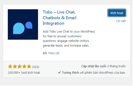 Sau khi cài đặt xong, click chọn “Kích hoạt” để kích hoạt Plugin Tidio Chat.
