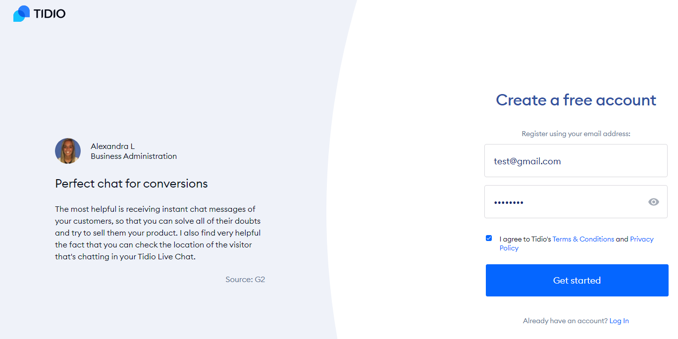 Bạn sẽ được đưa đến trang web Tidio. Tại đây, bạn nhập email, password và và tích vào ô đồng ý điều khoản, rồi click vào nút “Get started”.