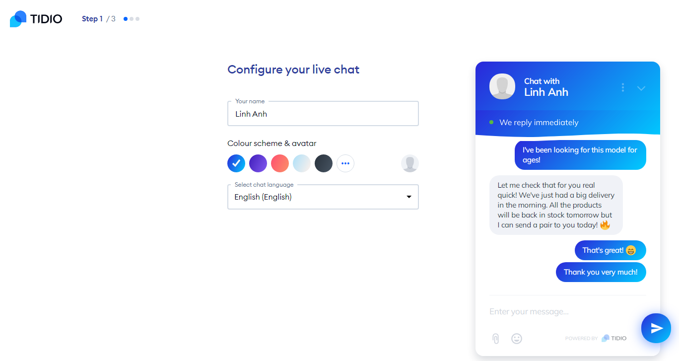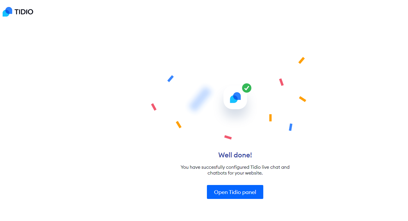 Sau đó, giao diện trò chuyện website của bạn được kích hoạt ngay lập tức. Bạn click vào nút “Open Tidio panel” để quản lý cài đặt, tùy chỉnh giao diện bảng trò chuyện của mình và tương tác với khách truy cập từ bảng quản trị trong website tidio.com.
