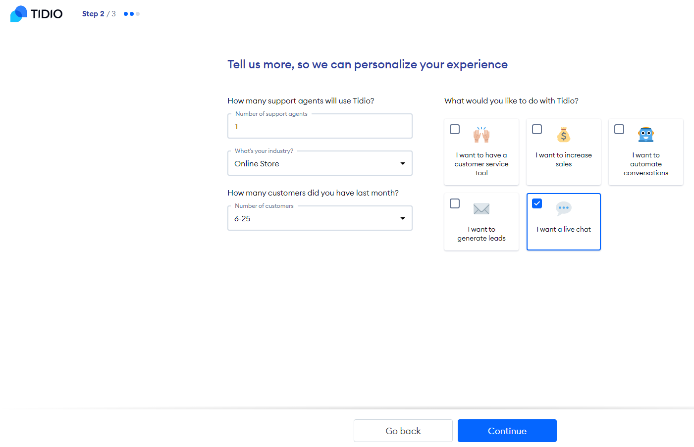 Ở bước tiếp theo, bạn nhập số lượng đại lý hỗ trợ, chọn ngành nghề website và tích vào ô bạn muốn làm gì với Tidio. Sau đó, click nút “Continue”.