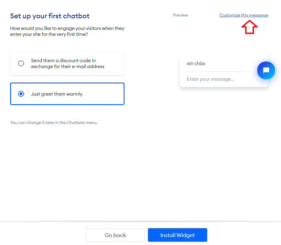 Bước 3 này, bạn có 2 lựa chọn để chào mừng những khách hàng lần đầu nhắn tin trên website. Với mỗi lựa chọn, bạn có thể tùy chỉnh lại câu chào theo ý muốn bằng cách click vào Customize this messsage.