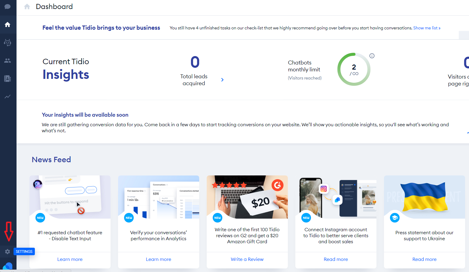 Trong trang tổng quan Tidio, nhấp vào biểu tượng bánh răng để truy cập cài đặt.