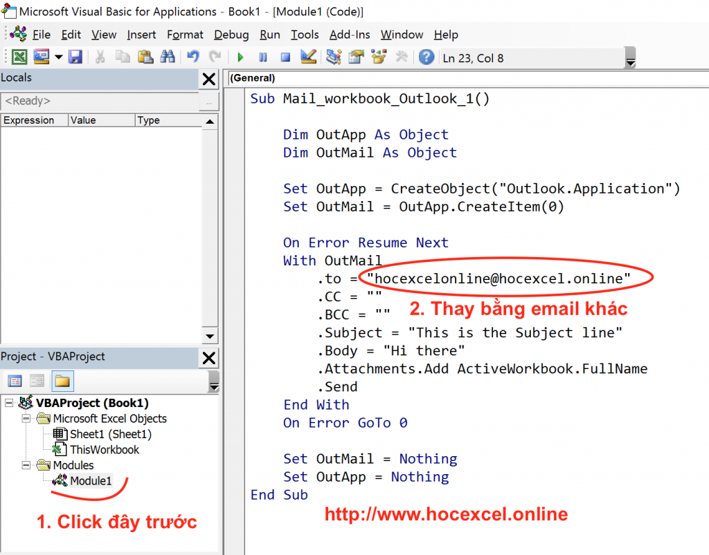 Bước 3: Thay Email trong code bằng Email cần dùng ở tất cả các vị trí .to = “<email>”, thay tiêu đề (Subject) và nội dung thư (Body), …