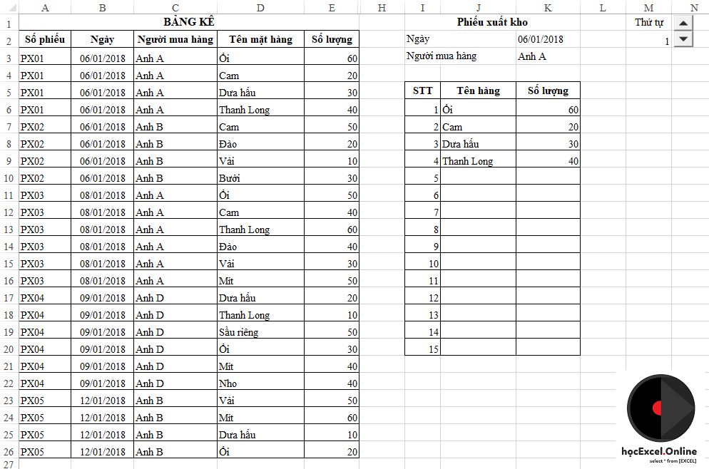 Cho bảng tính sau, sử dụng Spin Button để thay đổi nội dung của Phiếu Xuất kho tương ứng theo mỗi số phiếu trong bảng kê