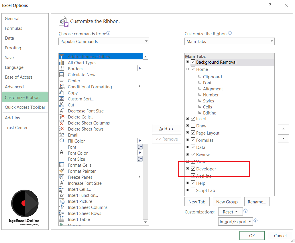 Mở tab Developer trên thanh công cụ (Click chuột phải vào thanh công cụ, chọn mục Customize the Ribbon, trong mục này đánh dấu chọn vào thẻ Developer)